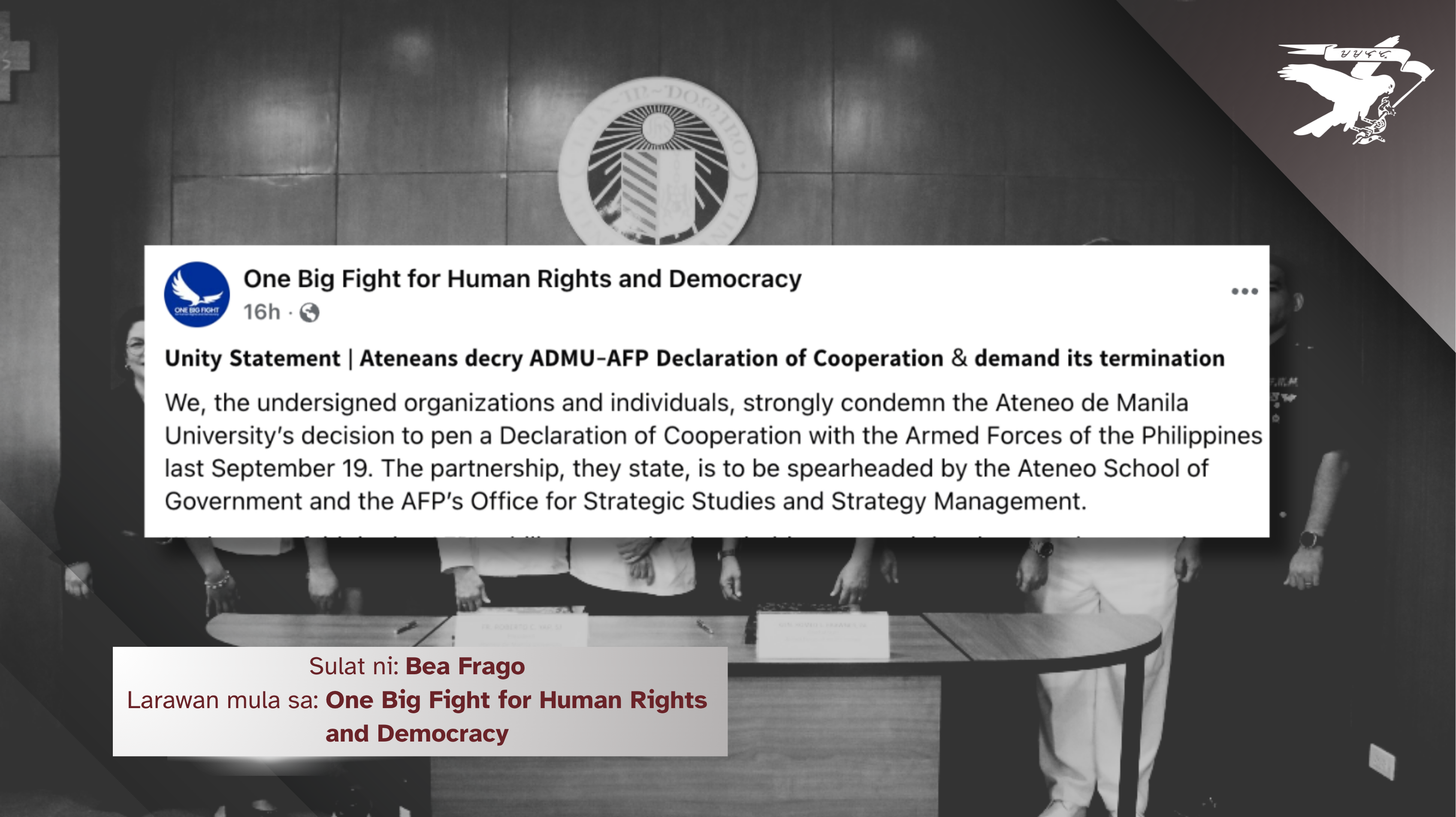 Umani ng labis na kritisismo sa social media ang muling paglagda ng Pamantasang Ateneo de Manila sa Declaration of Cooperation kasama ang Armed Forces of the Philippines (AFP) nitong ika-19 ng Setyembre, upang ipagpatuloy ang kolaborasyon para sa mga inisyatibang sumusuporta sa pamumuno at pangangasiwa ng militar sa bansa.